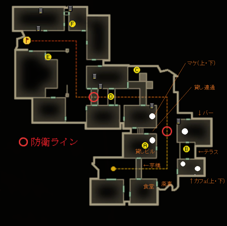 これは貸しの守りを堅くしつつメイン・食堂からカフェ・貸しに入る敵に少しでもダメージを与え、殲滅するための配置だと思っています。この役割は貸し連通の人がメインですね。交戦距離は中、遠距離になりがちなのでM4等の安定銃が好ましい。貸し中の人は芋橋に集中できます。
