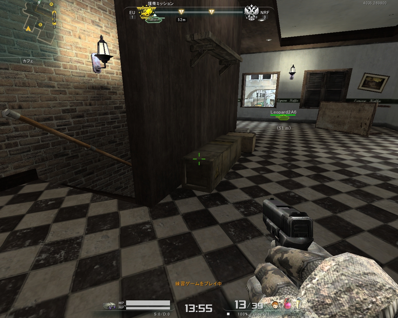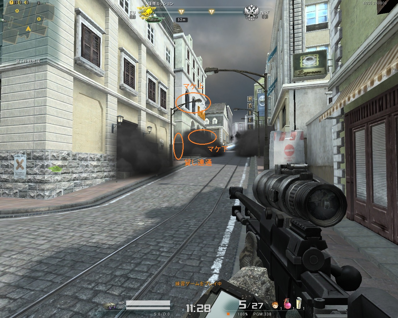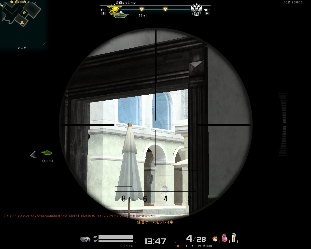 マケ上、マケ下の敵を狙うことができます。テラスからカフェに入る敵も反応できれば倒せます。