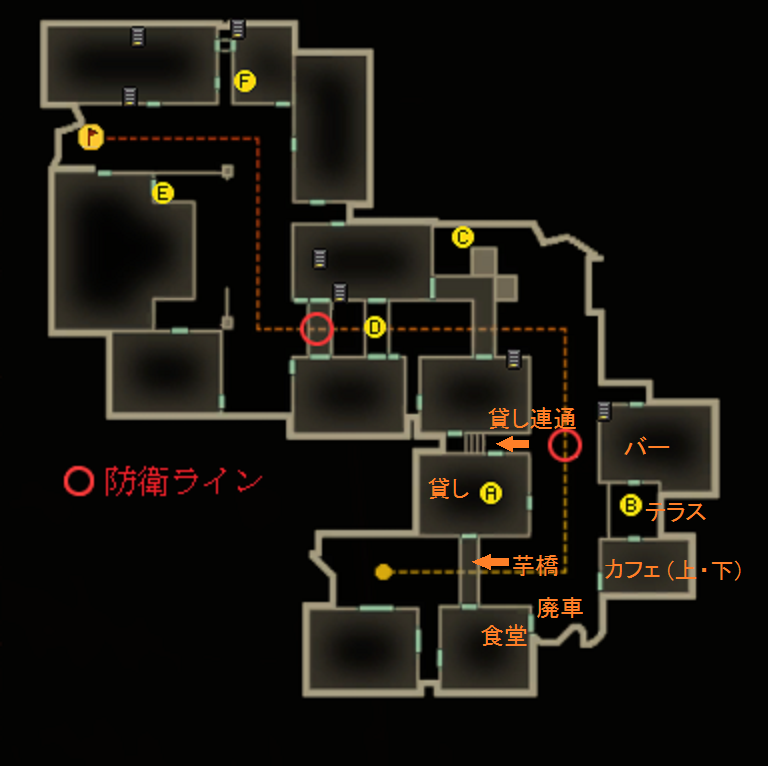 目安としては大体貸し入り口と貸し連通、マケ下、バー入り口付近に投げると良いです。