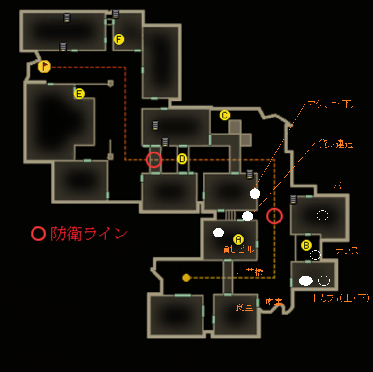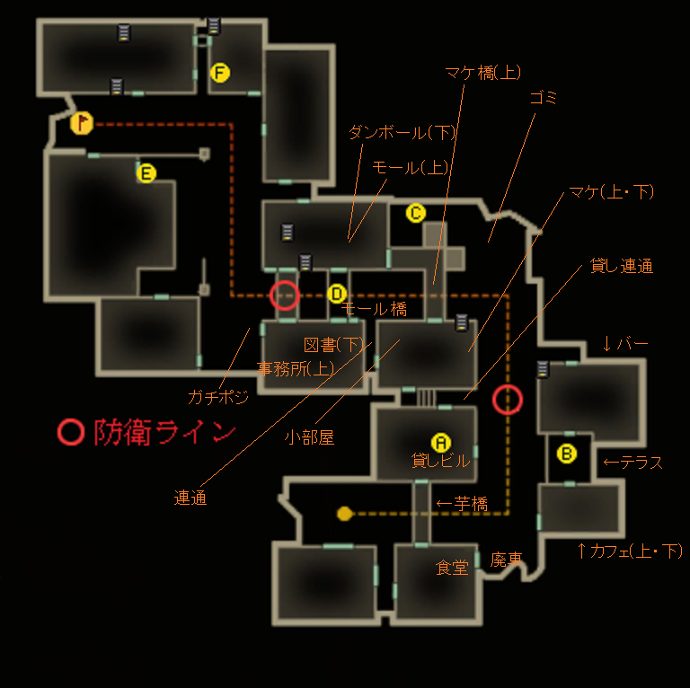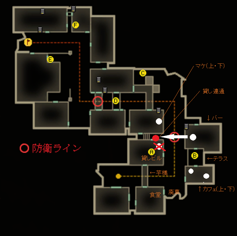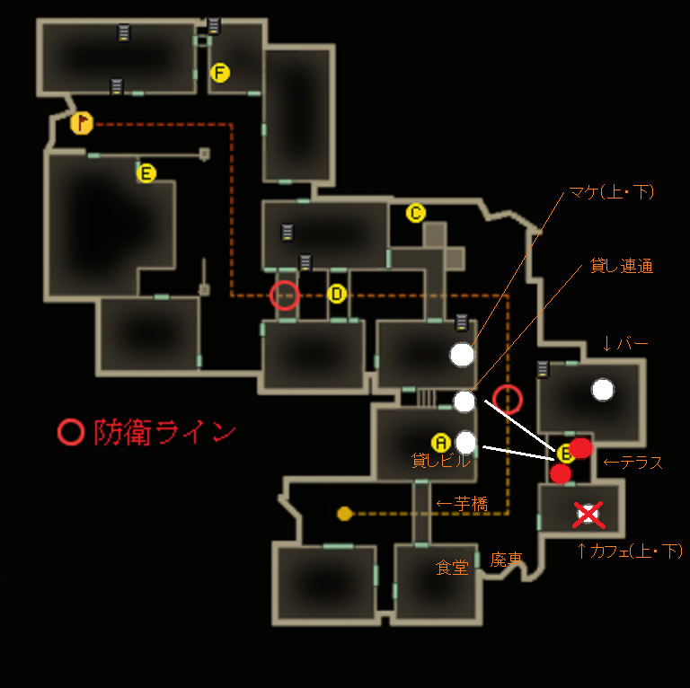これは貸しの守りを堅くしつつメイン・食堂からカフェ・貸しに入る敵に少しでもダメージを与え、殲滅するための配置だと思っています。この役割は貸し連通の人がメインですね。交戦距離は中、遠距離になりがちなのでM4等の安定銃が好ましい。貸し中の人は芋橋に集中できます。